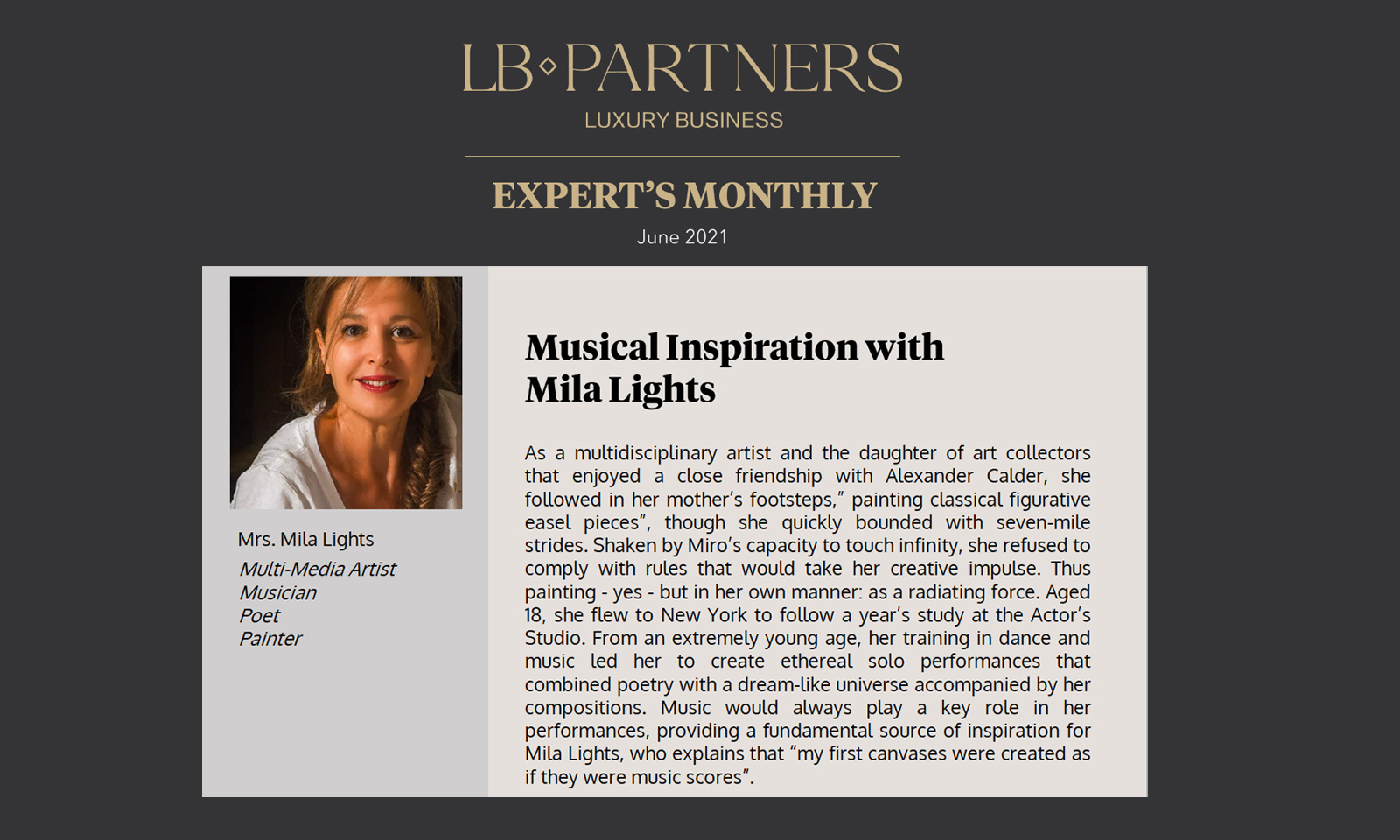 As a multidisciplinary artist and the daughter of art collectors that enjoyed a close friendship with Alexander Calder, she followed in her mother’s footsteps,” painting classical figurative easel pieces”, though she quickly bounded with seven-mile strides. Shaken by Miro’s capacity to touch infinity, she refused to comply with rules that would take her creative impulse. Thus painting – yes – but in her own manner: as a radiating force. Aged 18, she flew to New York to follow a year’s study at the Actor’s Studio. From an extremely young age, her training in dance and music led her to create ethereal solo performances that combined poetry with a dream-like universe accompanied by her compositions. Music would always play a key role in her performances, providing a fundamental source of inspiration for Mila Lights, who explains that “my first canvases were created as if they were music scores”.