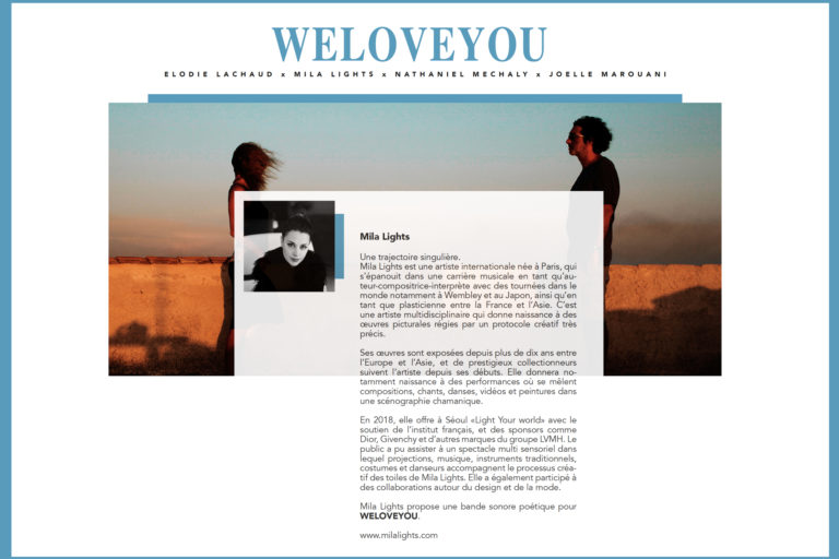 Mila Lights est heureuse de vous annoncer en avant première, sa collaboration à la création du film WELOVEYOU L’Amour est l’énergie la plus puissante, il est le lien universel. WELOVEYOU Comment célébrer l’amour librement, poétiquement, artistiquement, en harmonie avec la nature, les éléments, la lumière? Ou comment rentrer en résistance pour traverser ensemble cette pé-riode…