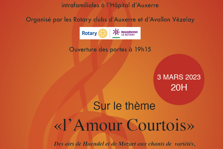 « l’Amour Courtois » Des airs de Haendel et de Mozart aux chants de variétés, extraits d’Opérettes, mélodies, chansons à thèmes Barbara, Brel, Lama, Janis Jopling, Mila, extraits de Starmania. Spectacle caritatif au théâtre d’Auxerre Pour créer une unité d’accueil dédiée aux victimes de violences intrafamiliales à l’Hôpital d’Auxerre. Organisé par les Rotary clubs d’Auxerre et d’Avallon…
